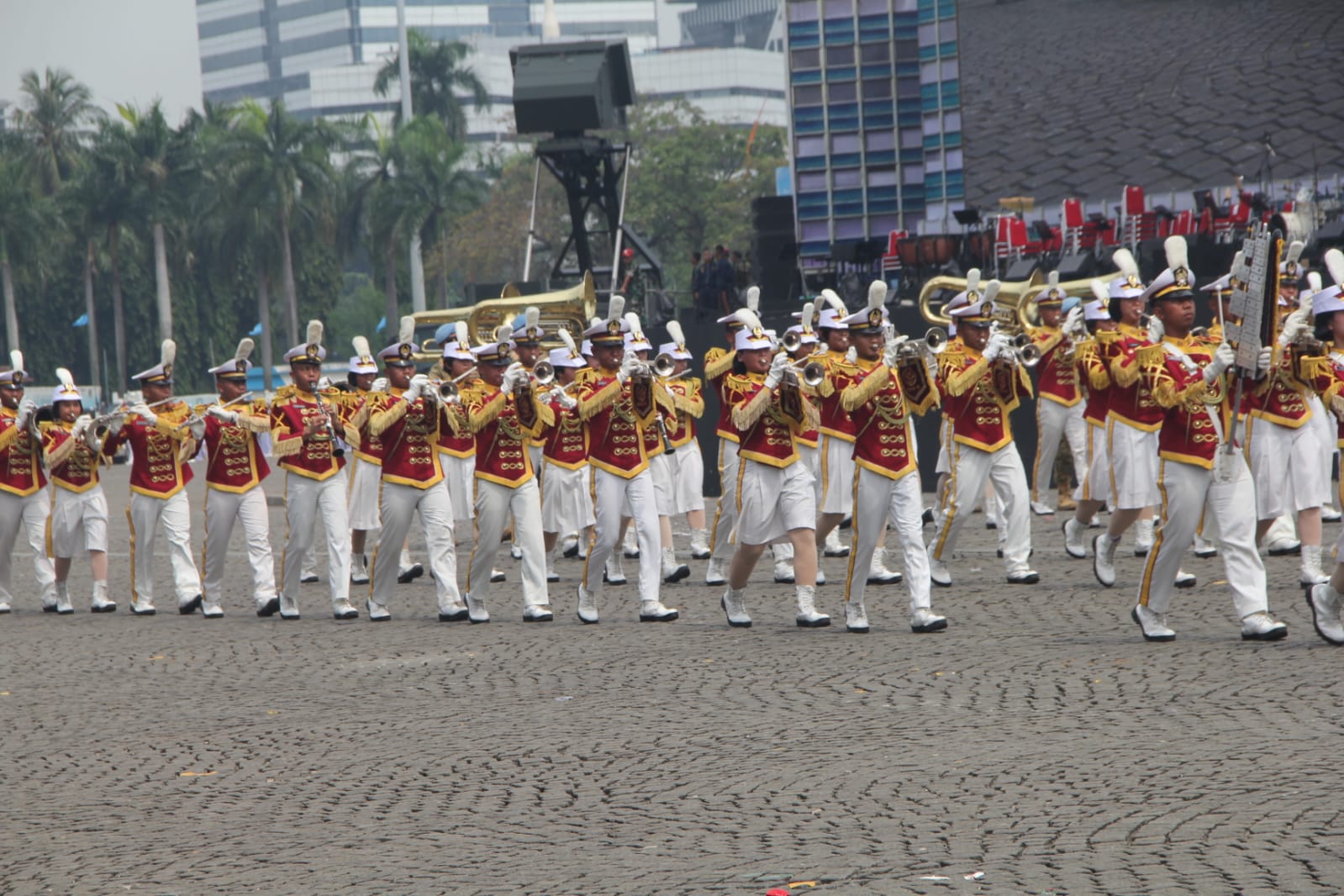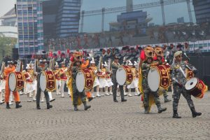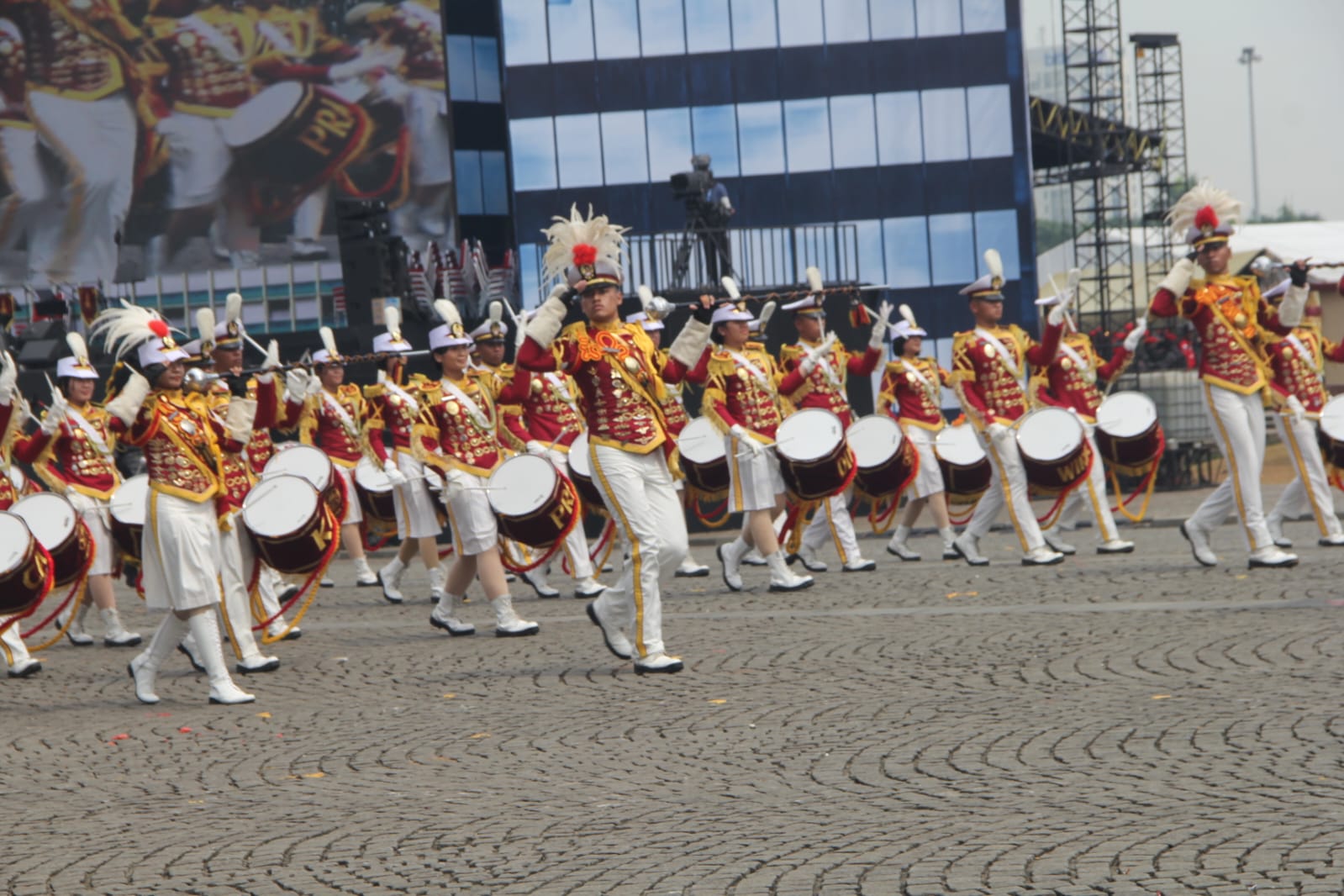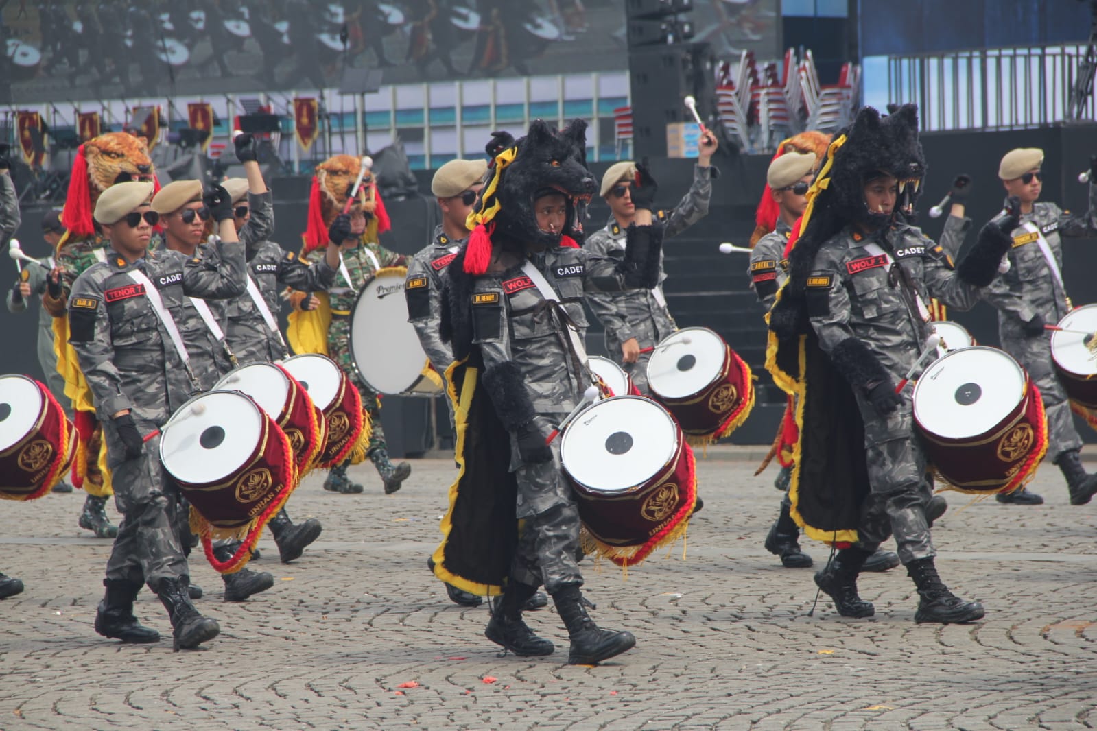 Sebagai pembuka parade dan defile pasukan, Drumband Kadet Mahasiswa Unhan RI “Canka Praditya Wiratama” menampilkan formasi megah dengan harmonisasi langkah dan musik yang menggugah semangat seluruh peserta upacara. Penampilan tersebut menjadi simbol disiplin, ketangkasan, dan jiwa korsa yang ditanamkan selama proses pendidikan militer dan akademik di lingkungan Unhan RI.