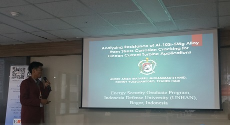Dalam kesempatannya mahasiswa Unhan yang bernama Andre Amba Matarru memaparkan paper yang berjudul Analyzing Resistance of Al-10Si-5Mg Alloy from Stress Corrosion Cracking for Ocean Current Turbine Applications.