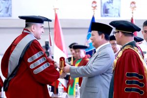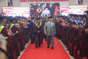 Bogor – Menteri Pertahanan sekaligus Presiden Terpilih Republik Indonesia 2024-2029, Jenderal TNI (Purn.) Prabowo Subianto, didampingi Plt. Rektor Unhan RI, Letnan Jenderal TNI (Purn.) Dr. Jonni Mahroza, S.I.P., M.A., M.Sc., Ph.D., mewisuda 425 mahasiswa Unhan RI dari Program Pendidikan Diploma (D3), Sarjana (S1), Magister (S2), dan Doktor (S3) untuk Tahun Akademik 2024. Kegiatan ini dihadiri langsung oleh pejabat tinggi kementerian dan lembaga serta pimpinan daerah dan pejabat Eselon I, dan II Unhan RI. di Gedung Aula Merah