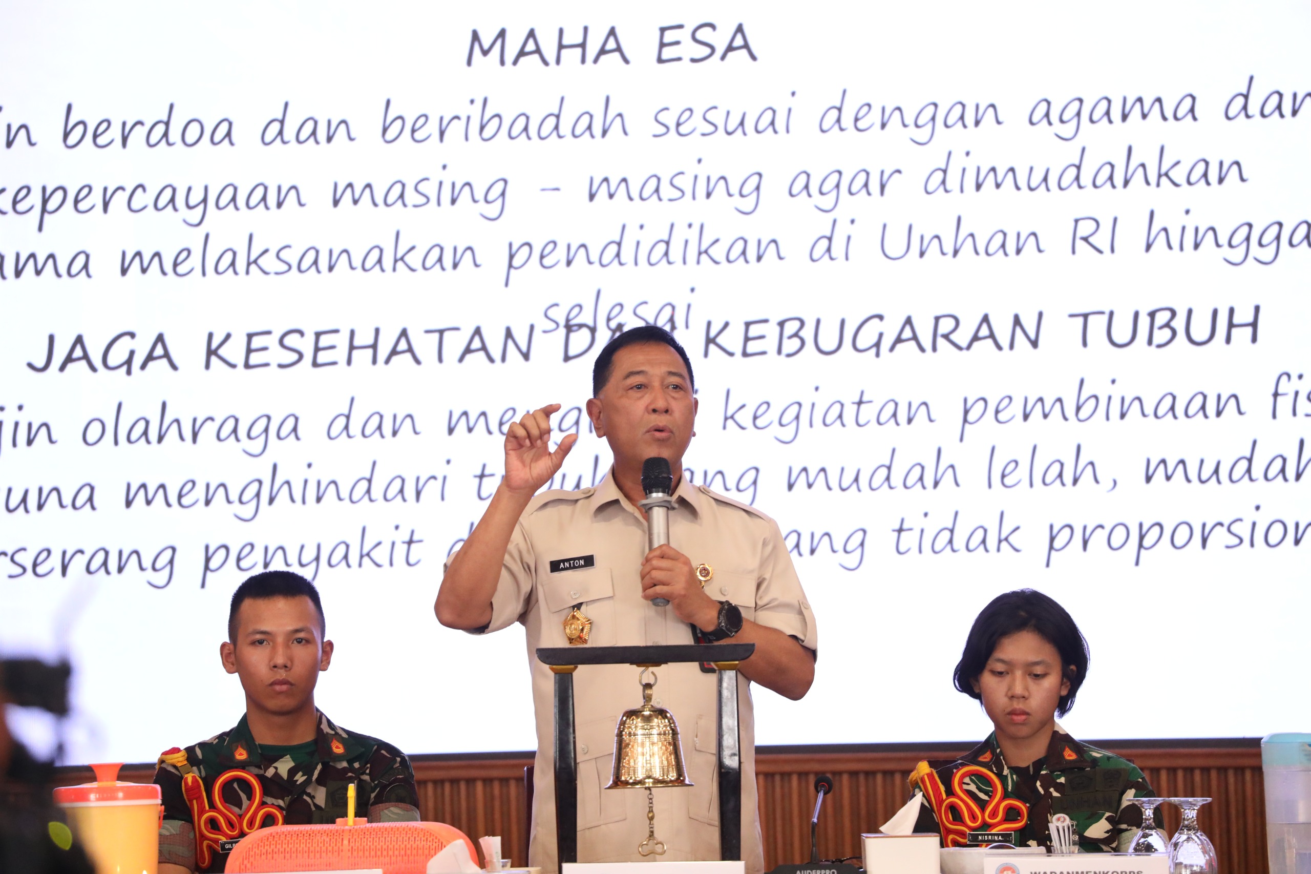 Rektor Unhan RI pada kegiatan pengarahan ini menegaskan bahwa kadet Unhan RI merupakan generasi penerus pertahanan negara yang disiapkan menjadi bagian dari Komponen Cadangan (Komcad) dan calon perwira TNI di masa depan. Pendidikan di Unhan RI diarahkan untuk membentuk insan pertahanan yang tangguh, disiplin, beriman, serta memiliki integritas dan tanggung jawab kebangsaan. Pembinaan karakter dilakukan secara terpadu melalui penguatan spiritual, penegakan disiplin, serta peningkatan kesiapan fisik dan intelektual sebagai bekal dalam pengabdian kepada negara.