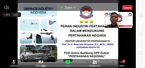 Bogor – Rektor Universitas Pertahanan Republik Indonesia (Unhan RI) Laksamana Madya TNI Prof. Dr. Amarulla Octavian.,S.T., M.Sc., DESD menjadi salah satu narasumber pada acara Focus Group Discussion (FGD) Balitbang Golkar Bid. Kajian Pertahanan & Keamanan dengan tema “Membangun & Mengembangkan Industri Pertahanan Untuk Mendukung Pertumbuhan Ekonomi Nasional”, yang dilaksanakan melalui daring zoom meeting. Senin, (17/01).