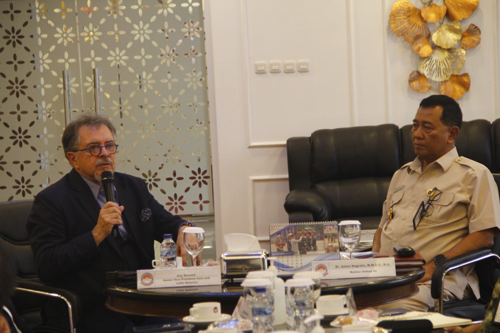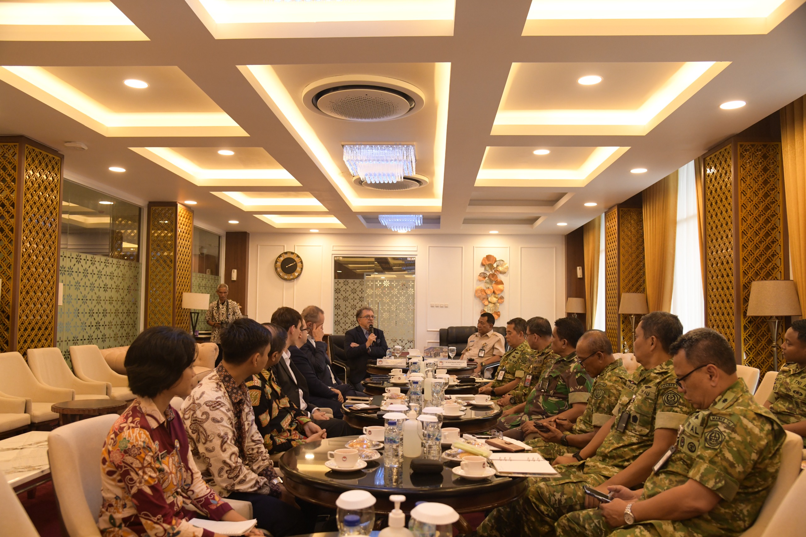 Bogor — Rektor Universitas Pertahanan Republik Indonesia (Unhan RI), Letnan Jenderal TNI (Purn.) Dr. Anton Nugroho, M.M.D.S., M.A., menerima audiensi Senior Vice President Thales Asia and Latin America, Guy Bonassi beserta delegasi Thales Group. Kunjungan ini merupakan tindak lanjut kerja sama antara Unhan RI dan Thales Group untuk mengembangkan kapasitas pendidikan dan riset di bidang Keamanan Siber (Cybersecurity) dan Teknologi Akustik/Sonar dalam kerangka penguatan ketahanan nasional berbasis teknologi. Kegiatan penerimaan kunjungan ini bertempat di Ruang Eksekutif Lounge Lantai-1, Kampus Bela Negara Unhan RI, Sentul. (Jum’at, 31/10).