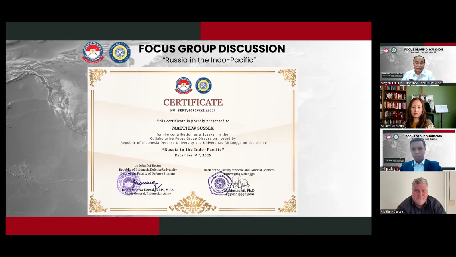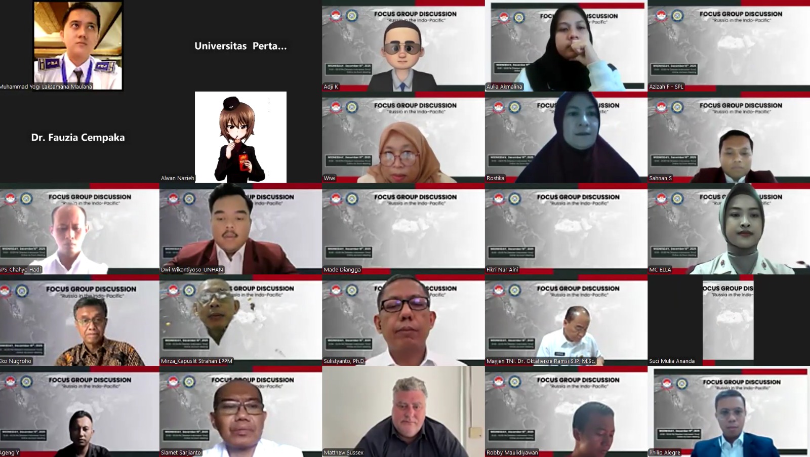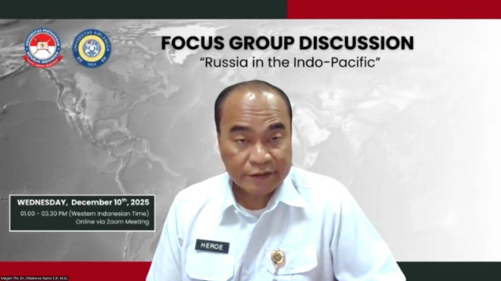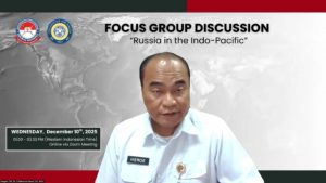 BOGOR (10/12/2025) – Fakultas Strategi Pertahanan (FSP) Universitas Pertahanan Republik Indonesia (Unhan RI) menyelenggarakan Focus Group Discussion (FGD) bertajuk “Russia in the Indo-Pacific”. Kegiatan yang dilaksanakan secara daring pada Rabu (10/12) ini bertujuan untuk memetakan dinamika keamanan regional di tengah meningkatnya kehadiran Rusia di kawasan Indo-Pasifik.