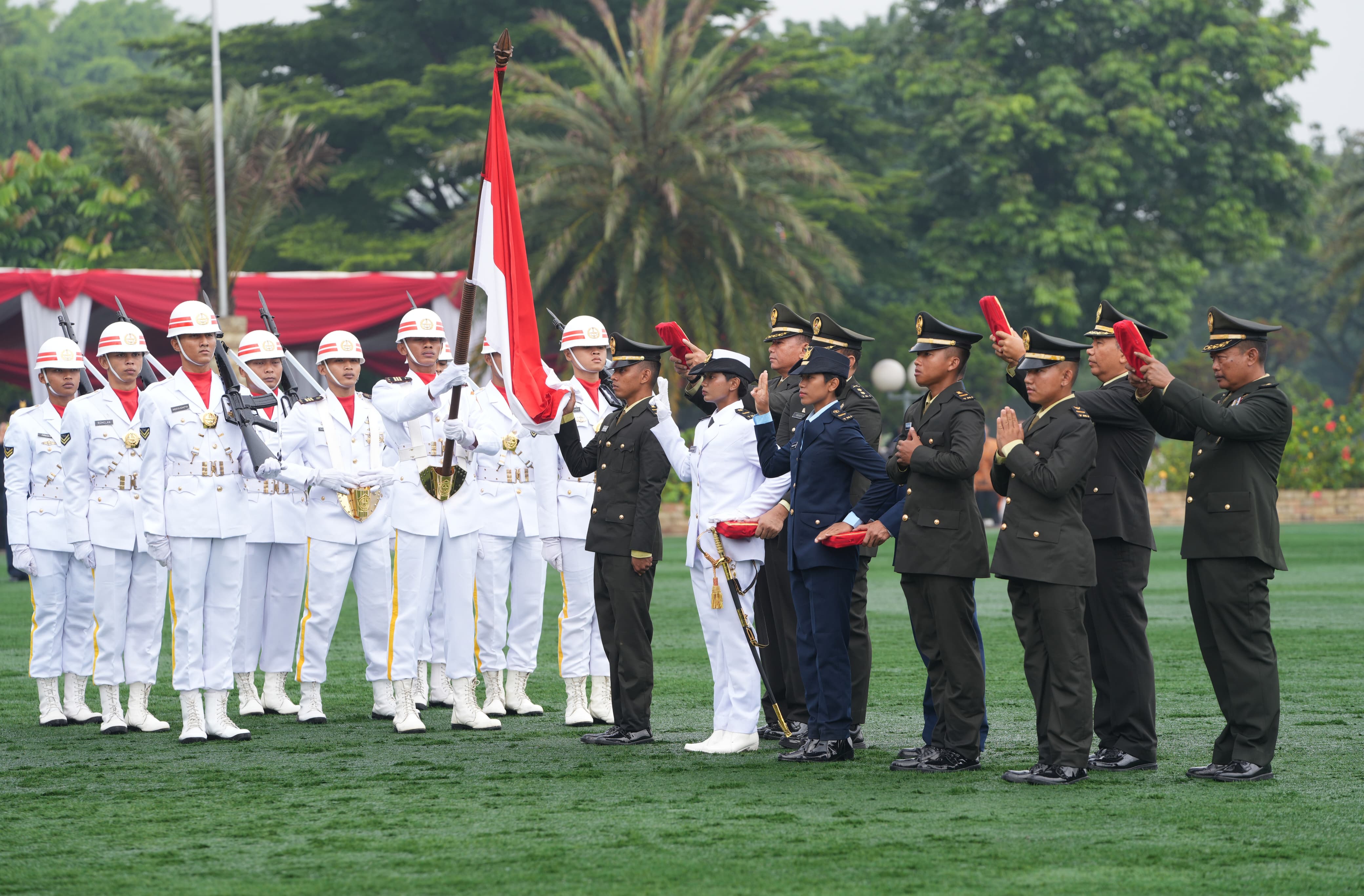 Usai upacara, Menhan RI Jenderal TNI (Purn.) Dr. Sjafrie Sjamsoeddin, M.B.A. menyampaikan ucapan selamat kepada sejumlah perwira TNI yang baru dilantik.