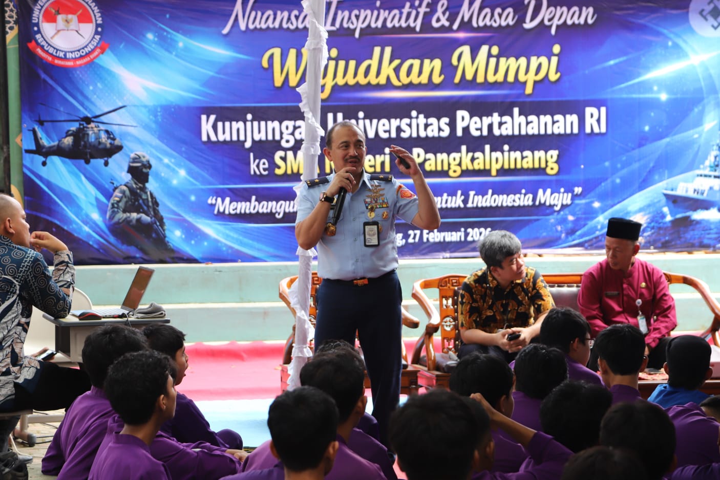 Pangkal Pinang – Universitas Pertahanan Republik Indonesia (Unhan RI) bersama PT Timah (Persero) Tbk memperkuat kolaborasi strategis dalam pembangunan sumber daya manusia unggul melalui kegiatan sosialisasi Program Beasiswa Pendidikan dan penguatan wawasan kebangsaan di SMA Negeri 1 Pangkal Pinang. Kegiatan ini merupakan bagian dari upaya membangun ekosistem pendidikan yang terintegrasi antara perguruan tinggi pertahanan dan dunia industri guna menyiapkan generasi muda yang kompeten, berkarakter, dan berdaya saing global. (Jum’at, 27/2).