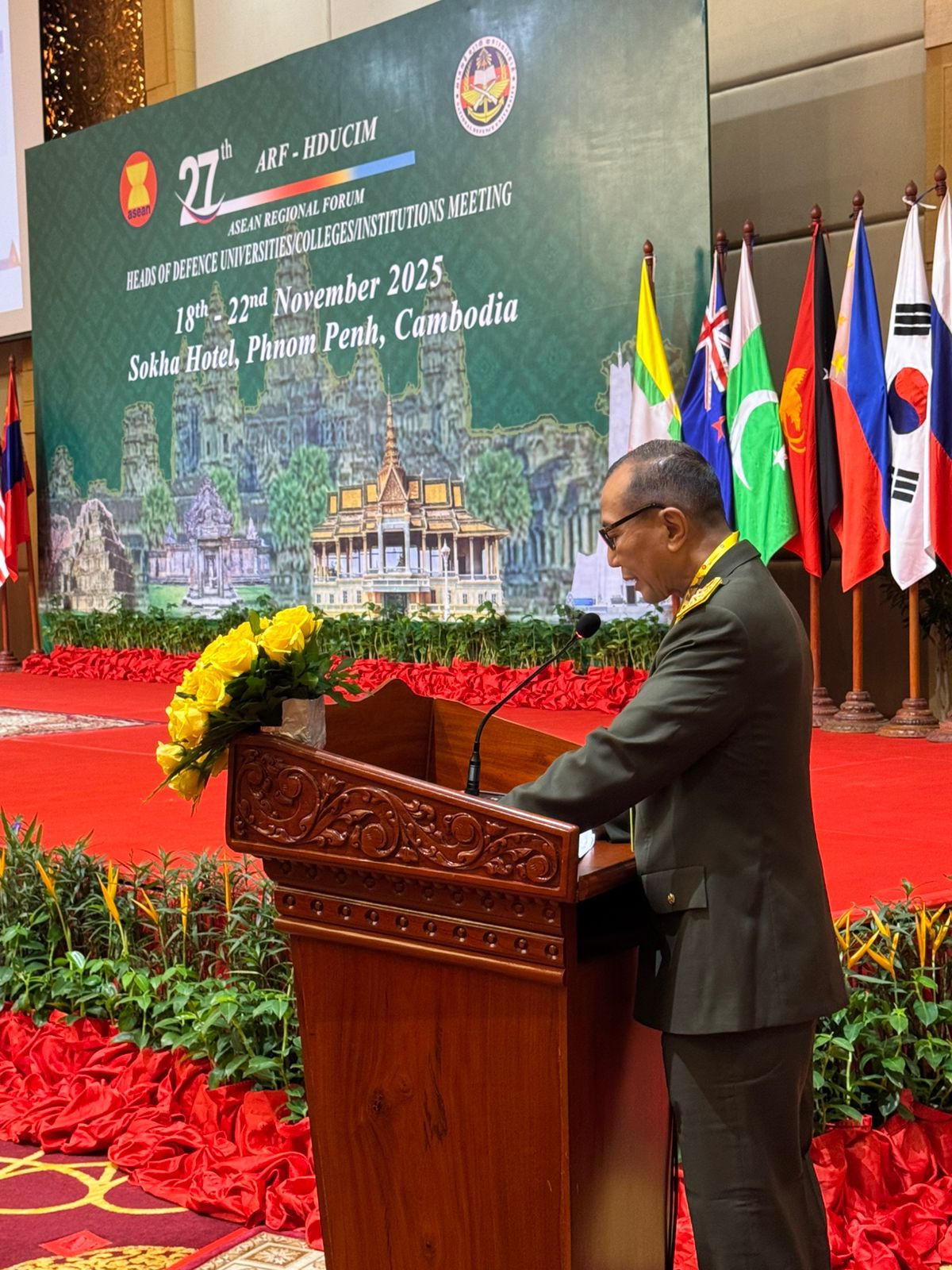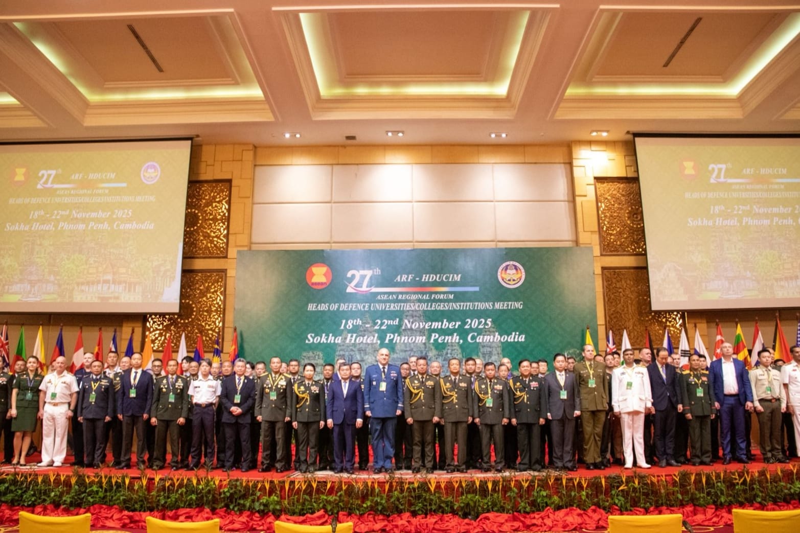 Phnom Penh, Kamboja – Rektor Unhan RI, Letnan Jenderal TNI (Purn.) Dr. Anton Nugroho, M.M.D.S., M.A., diwakili Mayor Jenderal TNI Dr. Totok Imam S., S.I.P., S.Sos., M.Tr.(Han)., Wakil Rektor III Bidang Kemahasiswaan dan Alumni Unhan RI, hadir pada kegiatan The 27th ASEAN Regional Forum Heads of Defence Universities/Colleges/Institutions Meeting (ARF-HDUCIM) Kegiatan ARF-HDUCIM ke-27 berlangsung mulai 18–21 November 2025 dengan tema “The Geopolitical Impacts of Environmental Disruption in Climate Security and the Role of Non-State Actors in Shaping Regional Security”. Pertemuan yang diselenggarakan bersama oleh NDU Kamboja dan Canadian Defence Academy (CDA) ini dihadiri oleh delegasi dari 16 negara yaitu Australia, Brunei Darussalam, Kanada, Republik Rakyat Tiongkok, Indonesia, Jepang, Laos, Malaysia, Uni Myanmar, Selandia Baru, Pakistan, Korea Selatan, Federasi Rusia, Singapura, Sri Lanka, Vietnam dan Kamboja. (Kamis, 20/11).