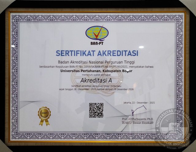 Penyerahan Penghargaan Sertifikat Akreditasi A Perguruan Tinggi ini Berdasarkan Keputusan Badan Akreditasi Nasional (BAN-PT) No. 1059/SK/BAN-PT/AK-PPJ/XII/2021, Universitas Pertahanan RI (Unhan RI) kembali dinyatakan memenuhi syarat peringkat “AKREDITASI A”, dengan sertifikat Akreditasi A, berlaku tanggal 28 Desember 2021 sampai dengan 28 Desember 2026.