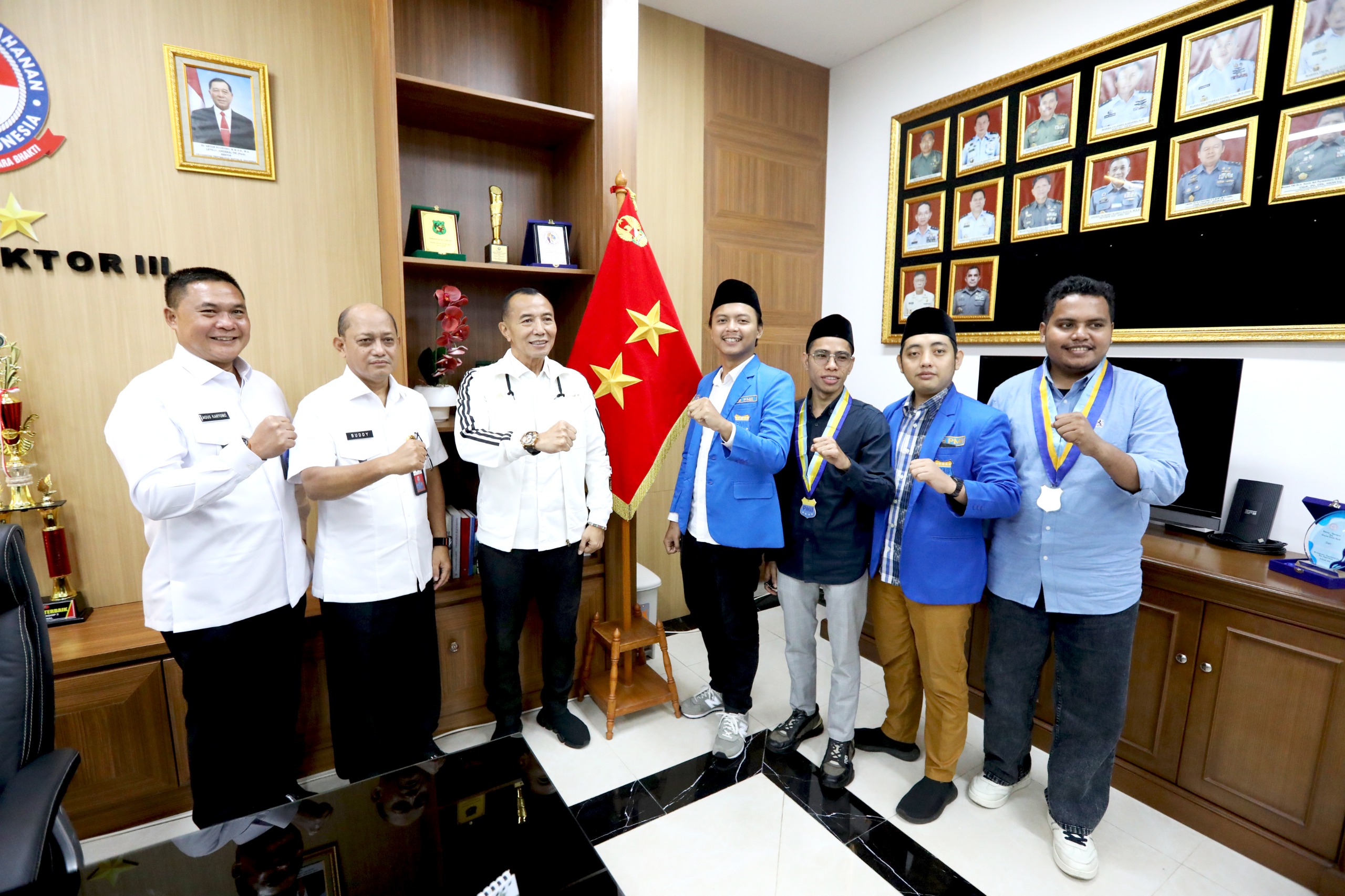 Bogor — Wakil Rektor Bidang Kemahasiswaan dan Alumni Universitas Pertahanan Republik Indonesia (Unhan RI), Mayor Jenderal TNI Dr. Totok Imam Santoso, S.Sos., S.I.P., M.Tr.(Han)., mewakili Rektor Unhan RI Letnan Jenderal TNI (Purn.) Dr. Anton Nugroho, M.M.D.S., M.A., menerima audiensi delegasi Pergerakan Mahasiswa Islam Indonesia (PMII). Kegiatan ini turut dihadiri langsung oleh Wakil Rektor Bidang Kerja Sama, Kelembagaan, Inovasi, dan Teknologi, Laksamana Muda TNI Buddy Suseto, S.E., M.Si.(Han)., Ph.D., yang berlangsung di Ruang Kerja Wakil Rektor Bidang Kemahasiswaan dan Alumni, Gedung Dekanat C, Kampus Bhinneka Tunggal Ika, Sentul. (Kamis 12/3).